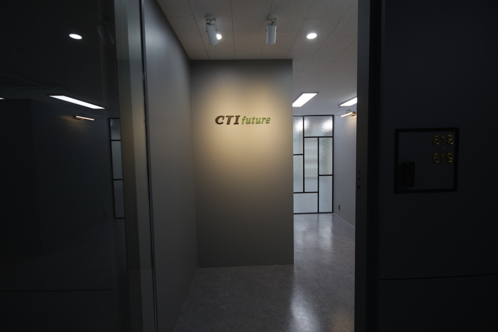 입구로 들어가면 가장 먼저 보이는 것은 이미지월입니다. 그레이 톤의 벽면에 디자인돼 있는 회사명을 천장 갤러리 조명이 비추고 있는 모습이 고급스러워 기업의 이미지를 대변하듯 보입니다. 이미지월 뒷편으로 프레임 디자인이 적용된 아쿠아 글래스 가벽이 보여 모던한 느낌이 연출되면서 세련돼 보이지만 조명의 따스한 색감 덕분에 아늑한 분위기를 풍기고 있습니다.