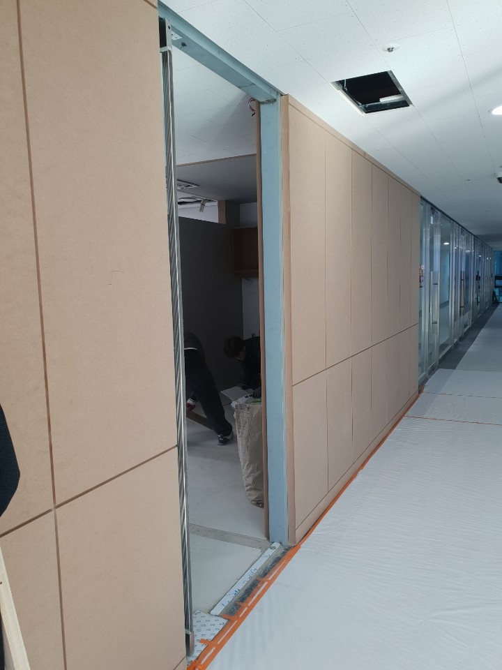 탕비시설, 입구 파사드, 천장 등의 목공 작업이 완료된 모습입니다. 저희 916디자인은 상담 후 현장 실측을 할 때부터 완공된 후 마무리 청소까지 깔끔하게 진행하고 있습니다.