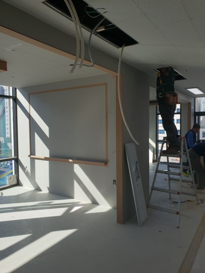 자칫했다가는 안전사고로도 이어질 수 있는 문제이기도 하므로 사무실인테리어 비용 체크!를 할 때 이런 부분을 꼼꼼하게 체크하고 확인하는 것이 중요합니다. 철거 및 점검이 끝나면 레이아웃에 따른 구조를 나누고 몰딩, 웨인스코팅, 이미지월 등의 꾸밈을 위한 목공 작업을 진행해 안전하고 안정적인 사무실을 만들어 드리고 있습니다.