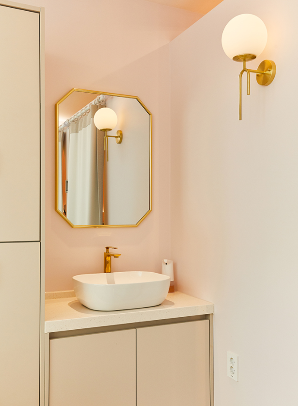시술 안쪽 공간에는 세면대를 설치하여 편리하게 사용하실 수 있도록 도움을 드렸습니다. 전체적인 공간과 어울리도록 거울과 수전에 골드 컬러를 넣어 드렸으며 하부에는 수납장으로 채워 완성도를 높였습니다. 거기에 옆쪽에 벽등까지 더하여 아늑하고 화사한 공간으로 만들어 드렸습니다.