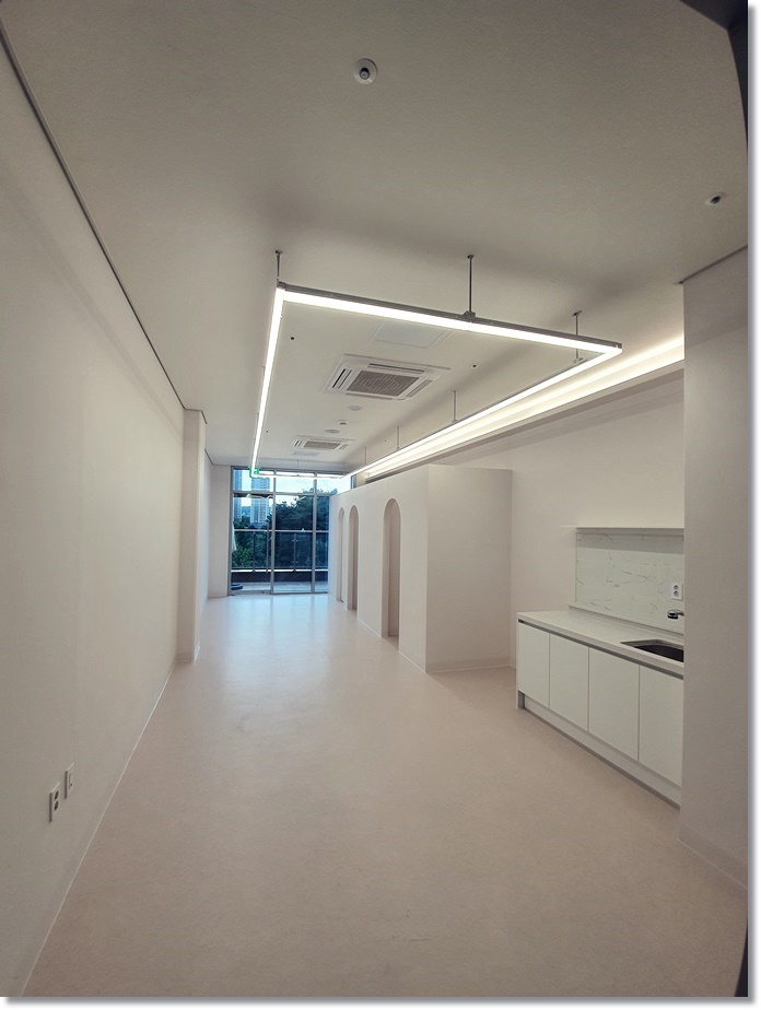 디테일하고 꼼꼼한 인테리어 설계 및 디자인을 바탕으로 완벽하게 시공을 해드려 완성한 회사 사무실 모습 만나 보시겠습니다. 깔끔한 공간 연출을 위해 천장에는 라인 조명으로 채워 드렸습니다. 그리고 한쪽 부분에는 화사함을 높이기 위해 간접등박스를 더한 모습 확인해 보실 수 있습니다.