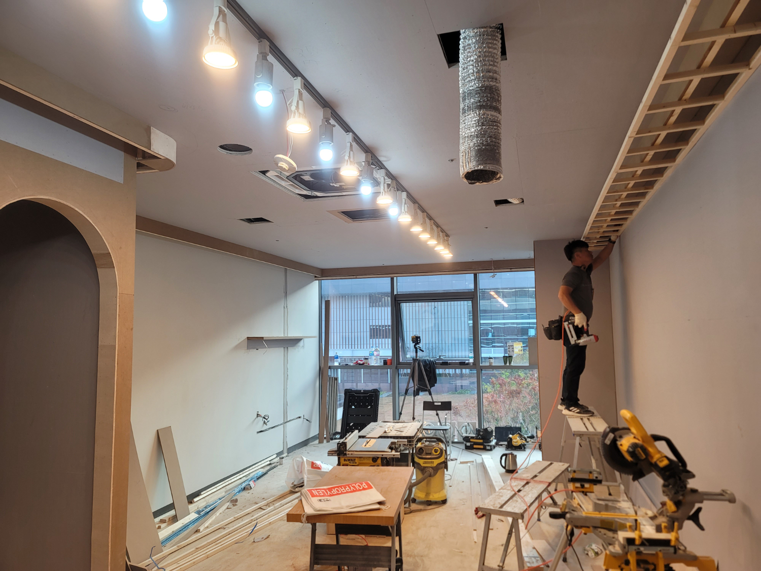 다음은 목공 작업입니다. 목공 작업으로 새로운 공간의 틀을 만들었고 파사드와 같은 디자인적인 요소까지 다방면으로