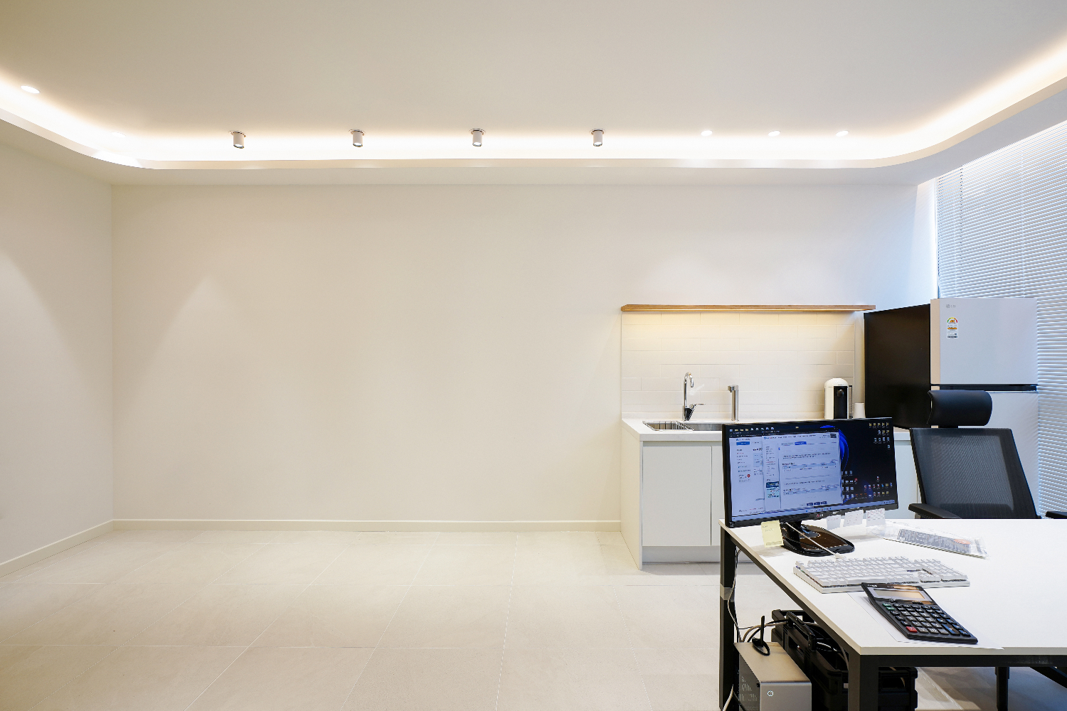 업무 공간 맞은편으로는 작은 탕비실을 구성 했습니다. 입구의 사인물과 동일한 골드 컬러의 벽선반과 간접등으로 포인트를 주었습니다. 탕비실도 전체적인 인테리어 컨셉과 동일하게 화이트로 깔끔하게 시공을 진행했습니다.