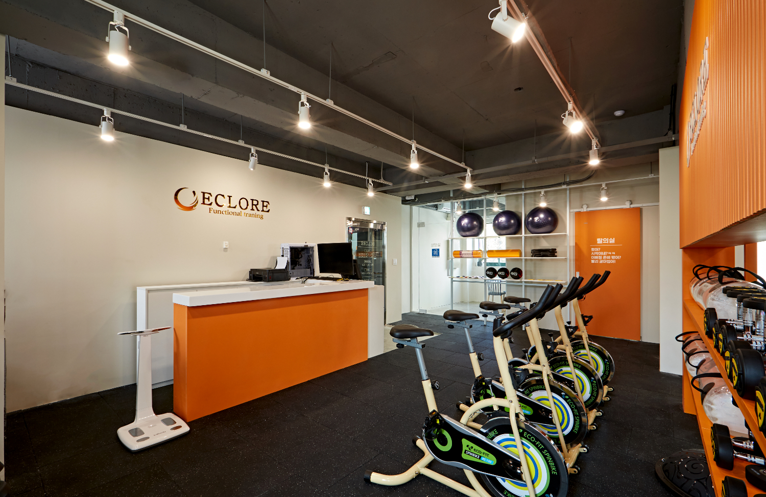 카운터 바로 옆에는 체중계를 준비하여 언제든지 고객님들이 자신을 체크할 수 있도록 하였으며, 입구 왼쪽에는 기구들을 간단하게 수납할 수 있는 공간도 마련하였는데요. 헬스장에는 생각보다 많은 소도구들이 존재하기 때문에 수납공간에도 항상 신경을 써야 합니다.