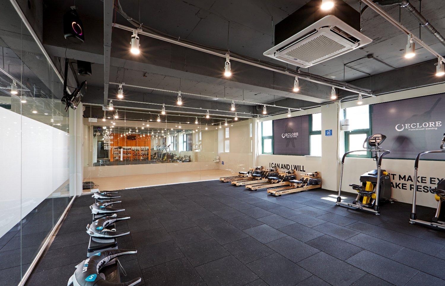 이 곳은 개인 피티룸이며 다양한 운동이 진행되는데요. 이번 현장의 특이한 점이라면 공간이 전부 분리가 되어있고 프라이빗하게 운영하겠다는 의뢰인분의 가치관에 따라서 가벽으로 공간을 분리하되 통창을 사용하여 개방감은 유지하였습니다.