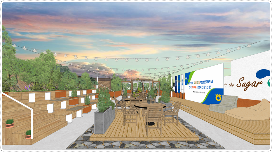 중앙의 배치 디자인입니다. 각 사이드에 공연장과 계단식 관람석을 두었고 가운데엔 테이블 좌석을 두어 다양한 형태로 활용할 수 있도록 했습니다. 가운데 테이블 공간은 바닥 마감을 석재와 우드로 디자인해 공간을 분리했고 테이블과 의자를 우드로 적용했으며 식물을 식재한 화분을 두어 내추럴한 감성을 극대화함으로써 마치 캠핑장에 온듯한 느낌이 들도록 했습니다.