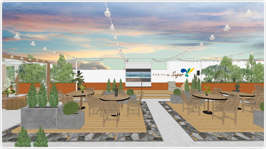 무대 공간 맞은편 사이드는 계단식 좌석으로 꾸며 관람석의 기능을 하면서 자유로운 휴식 공간이 되도록 했으며 식물을 식재할 수 있는 화분을 둘 수 있는 형태로 디자인했습니다. 전체 조명은 천장에 일정한 간격으로 매달려있는 줄전구라고 하는 스트링라이트로 계획해 은은한 불빛으로 감성 인테리어를 연출하면서 공기의 흐름에 따라 풍부한 연출이 가능하도록 했습니다.