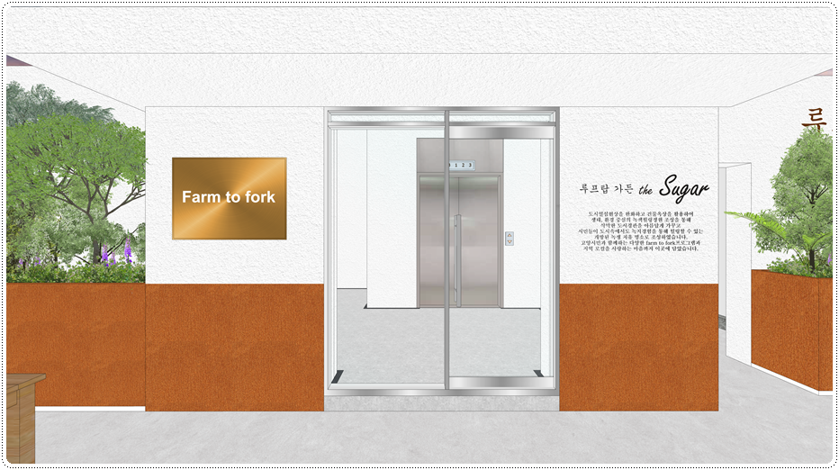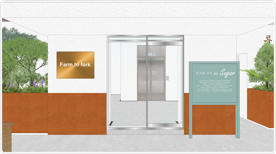 입구 디자인입니다. 글래스 도어, 골드 간판 등을 디자인해 심플하면서 세련된 느낌을 주었고 루프탑 공간에 대한 설명 사인물을 계획해 공간의 목적을 대해 설명할 수 있도록 했습니다. 루프탑 설명 사인물은 두 가지 안으로 제안을 드렸는데요, 하나는 벽면에 스펠링 사인물로 제작하는 디자인이고 다른 하나는 조형물을 따로 세워 필요에 따라 행사 안내판으로도 활용할 수 있는 안입니다.