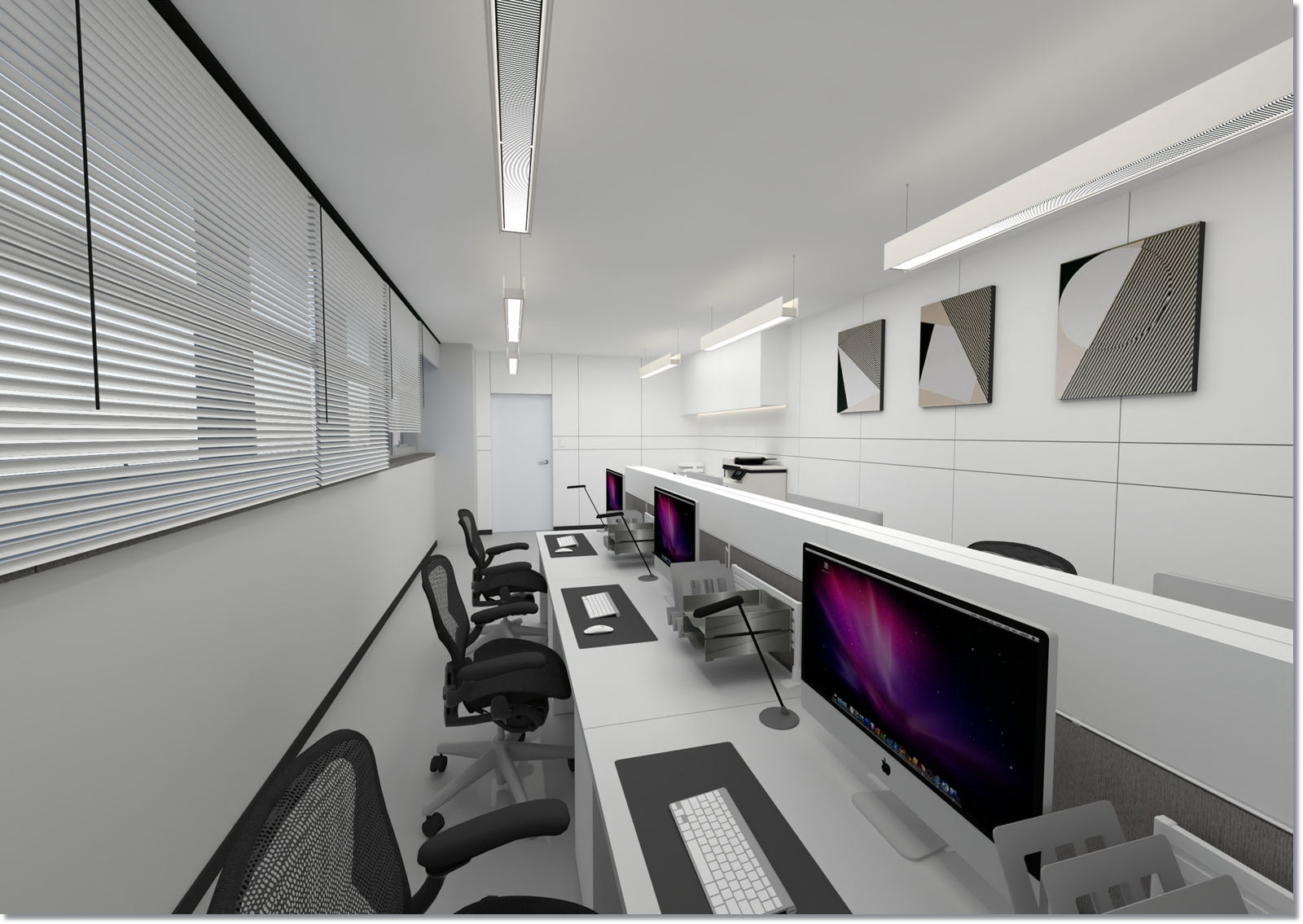 사무 공간으로 제안드린 3D 이미지입니다. 전체적으로 화이트를 적용해 벽면, 바닥, 가구 등을 디자인했고 시계, 액자 등의 소품을 활용했으며 사무기기를 한 곳으로 몰아 편의성과 사용성을 높였습니다. 자연광을 받을 수 있는 창문으로 배치를 했지만 너무 강한 빛은 업무에 방해가 될 수 있어 블라인드를 적용해 조절할 수 있도록 했습니다.