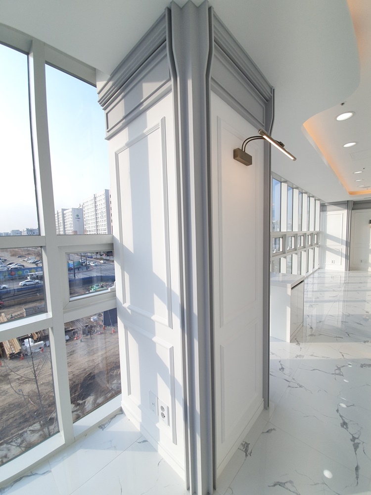 공간에 위치해있던 기둥에 몰딩, 웨인스코팅 등의 인테리어 디자인을 더해 호텔식의 럭셔리한 기둥으로 탈바꿈 해드렸습니다. 시공 전, 애매하게 서있어 애물단지 같아 보였던 기둥이었는데 단조로운 색으로만 마감하지 않고 화이트와 그레이 컬러로 마무리하고 보니 꽤 멋스러운 모습을 뽐내고 있네요. 클래식하면서 모던한 느낌의 벽부등도 한 목 해준 것 같아 디자이너로서 참 뿌듯한 현장이었습니다. 시공을 하다보면 현장에서 변수가 생기는 일들이 종종 있는데요,