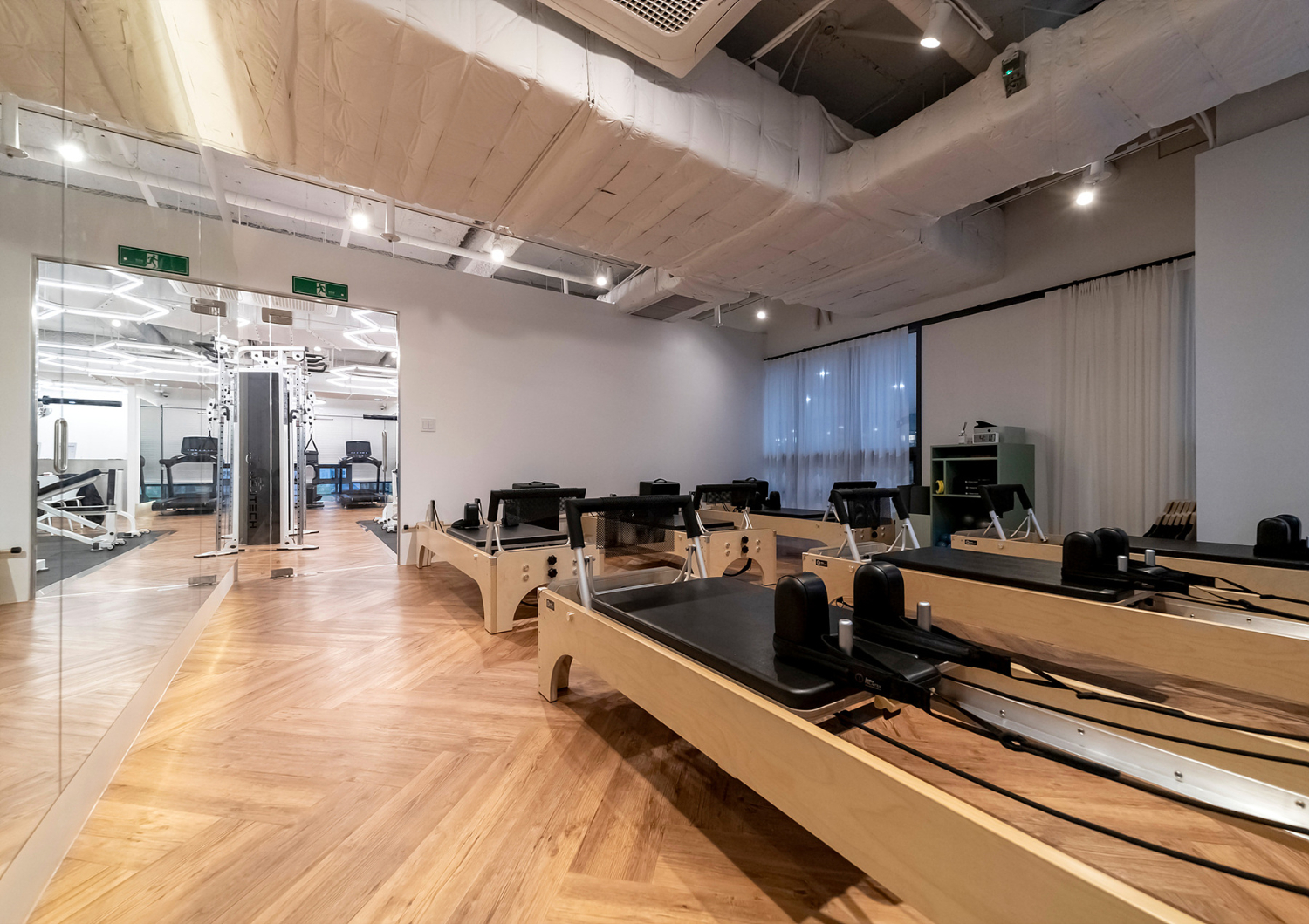 또한 공간마다의 크기가 좁지않고 넓은 편이지만 다양한 기구가 들어가는만큼 여러가지를 신경쓰고 거울에 자신의 모습이 오롯이 비칠 수 있도록 연출하였습니다. 그리고 통창마다 커튼을 설치하여 햇빛 및 시야를 차단하고 프라이빗한 수업 진행이 가능 하실 수 있도록 해드렸습니다.