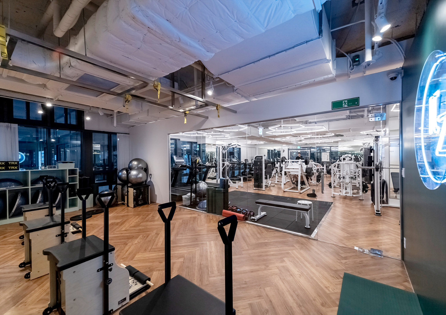 기구의 부피가 큰편이기 때문에 어떻게 헬스장과 공간을 나눌지도 고려하였으며 기구끼리의 간격도 조정하여 최대 몇개를 설치하여서 공간의 효율성을 높일 수 있을지도 고려하였습니다. 또한 천장은 노출 시공 기법을 사용하여 탁 트인 천고로 넓어보이는 시각 효과를 주었고요