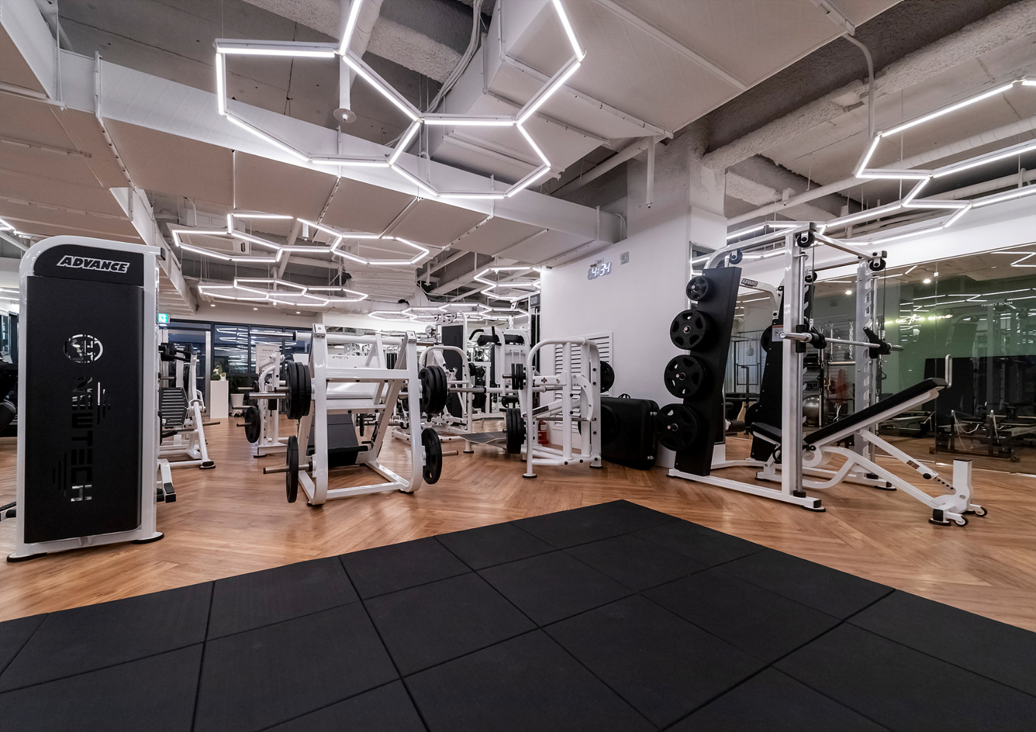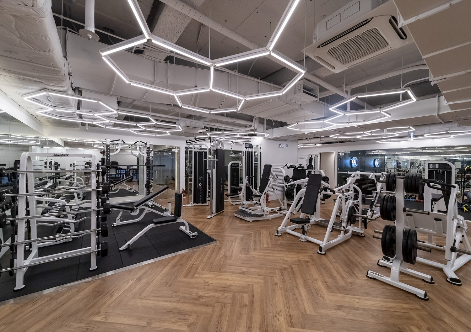 그 다음은 금천구 신림 신대방 헬스장인테리어의 헬스장인데 가장 먼저 눈에 들어오는 것은 바로 천장의 오각형 라인 모양 조명일텐데요. 마치 벌집같이 생긴 모양으로 곳곳을 밠혀주고 있으며 기존의 일자 라인 조명에서 변형한 형태로 볼 수 있습니다.