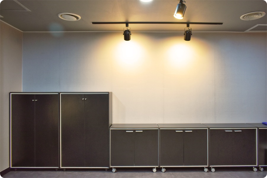 이동식 수납장이 놓여 있는 실용적인 공간입니다. 전체적인 분위기에 맞추어 선반 컬러나 디자인를 비슷하게 놓았으며 공간을 밝게 사용할 수 있도록 레일 조명으로 포인트를 주었습니다. 낮은 수납장으로 공간이 답답해 보이지 않도록 연출하였으며 작은 수납장의 경우 바퀴가 설치된 제품으로 넣어 실용성을 더욱더 높였습니다.