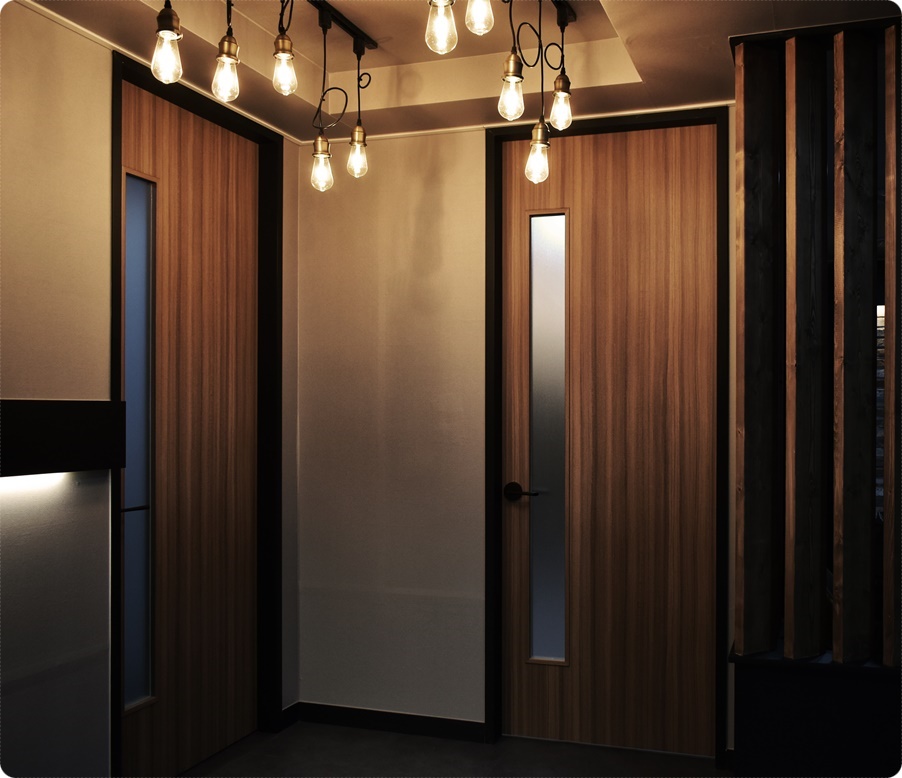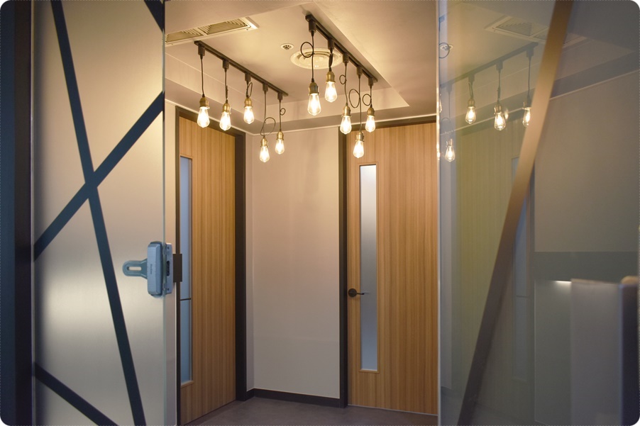 업무 공간 앞쪽에는 휴식 공간 및 간단한 미팅을 할 수 있는 공간을 만들어 드렸습니다. 천장에 심플한 펜던트 조명을 더하여 포인트를 주었으며 공간이 답답해 보이지 않도록 도어에 길게 타공하여 시공한 모습 확인해 보실 수 있습니다.