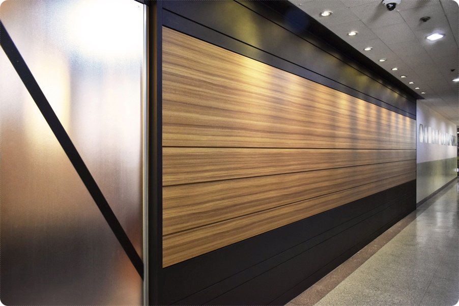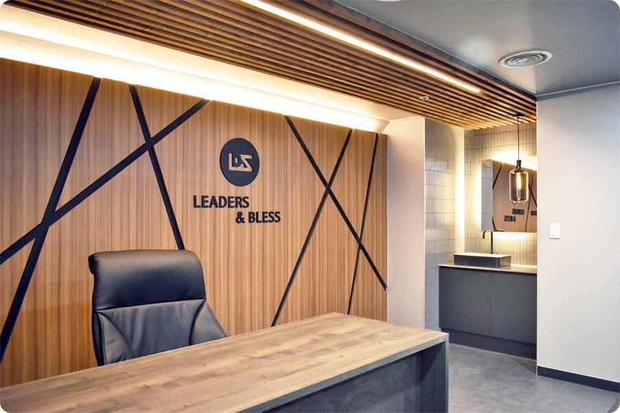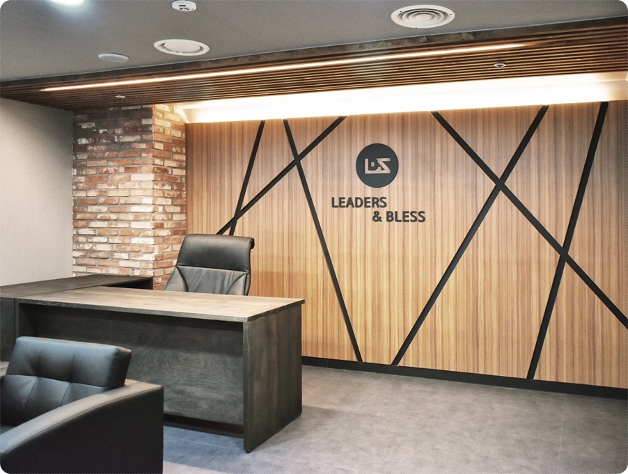 외부 인테리어에 회사 로고와 이름을 다른 컬러로 넣어 더욱더 돋보일 수 있도록 포인트를 주었습니다. 깔끔한 서채로 공간의 분위기와 맞게 연출하였습니다.