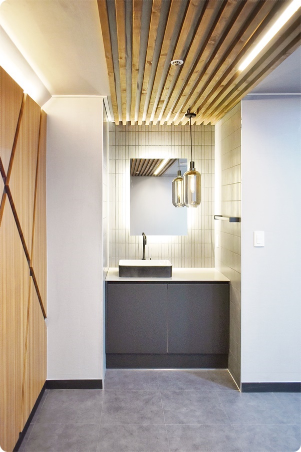 이번 김포 g타워 렌트카 사무실 인테리어, 고급스러운 블랙우드 포인트로 진행한 현장의 경우 개인 사무실 공간 한쪽에 세면대가 설치되어 있어 실용적인 측면을 높였습니다. 간접조명 연출로 따스한 분위기를 표현하엿으며 펜던트 조명으로 공간을 고급스럽게 연출하고 그레이 컬러로 모던하게 마무리 하였습니다.
