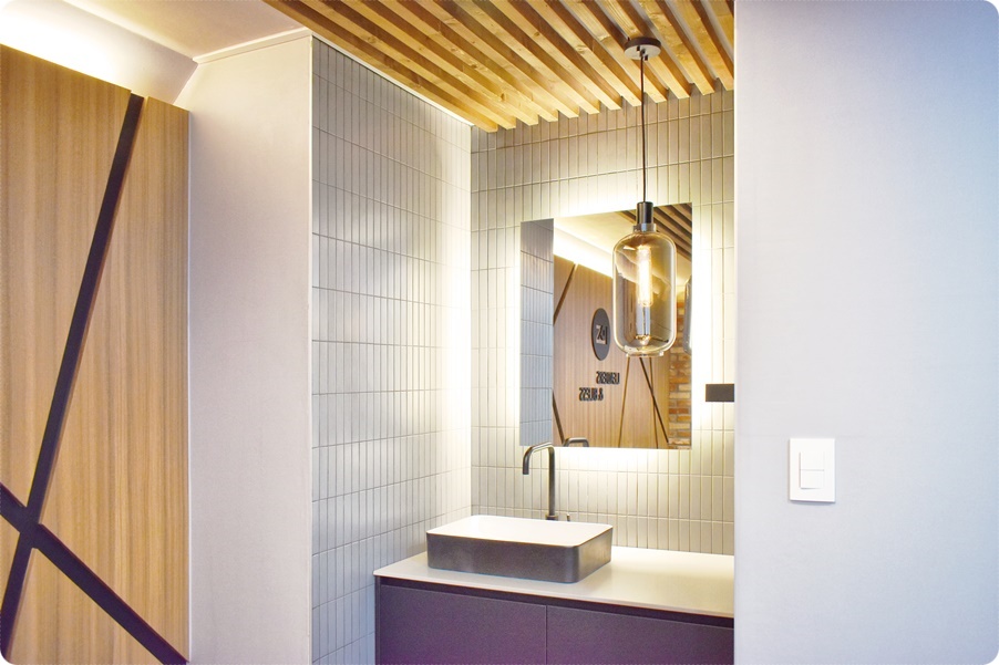앞서 보신 세면대 공간 옆쪽에는 업무 책상이 마련되어 있는 개인 사무실 업무 공간입니다. 멋진 디자인으로 벽면에 포인트를 주고 천장에 간접조명으로 화사함을 보여주었습니다. 벽돌 디자인과 우드 템바보드를 시공하여 공간의 멋스러움을 강조해 주었습니다.