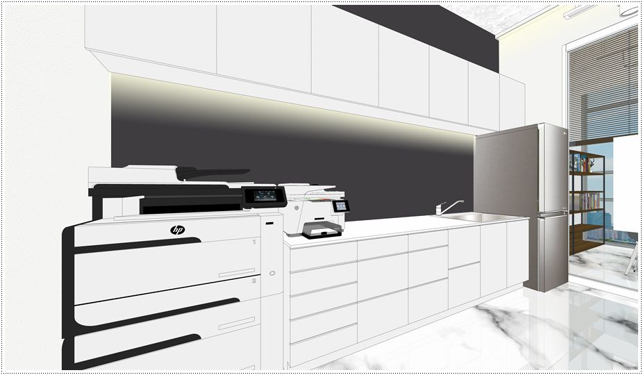 이 디자인을 하면서 가장 신경을 쓴 것 중 하나는 공간의 활용이었습니다. 그래서 공용 사무실에 복합기를 놓는 공간에 싱크대, 상부장, 하부장, 개수대를 함께 배치해 수납이 가능하면서 탕비실로도 활용할 수 있도록 제안드렸답니다.