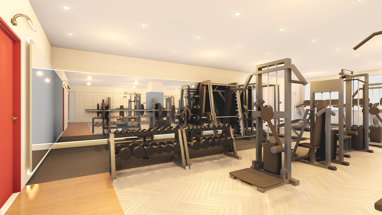 또한 중간 중간에 전면거울을 배치하여서 운동 시 바디 체크를 할 수 있는 실용성도 높이고, 공간을 넓게 보이게하는 시각적인 효과도 만들어냈습니다.