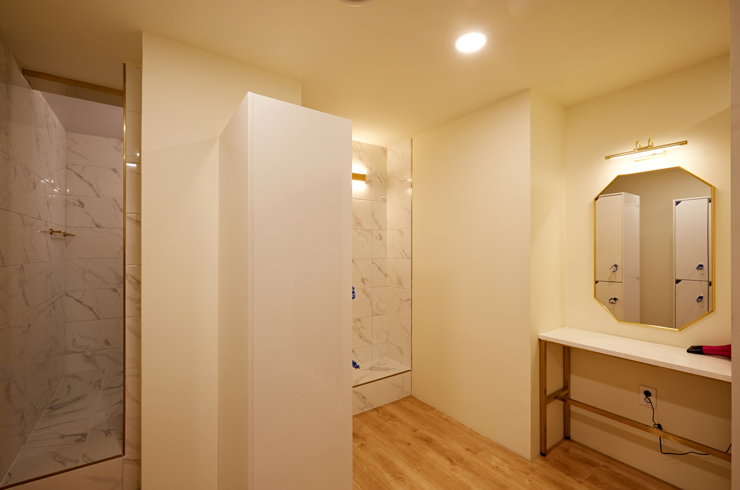 샤워실은 전부 대리석으로 만들어져있으며, 골드 색상으로 팔각 거울과 벽등을 통일하였습니다. 그리고 간단하게 화장대를 만들어 누구나 편안하게 준비하고 나갈 수 있는 공간으로 구축하였는데요.