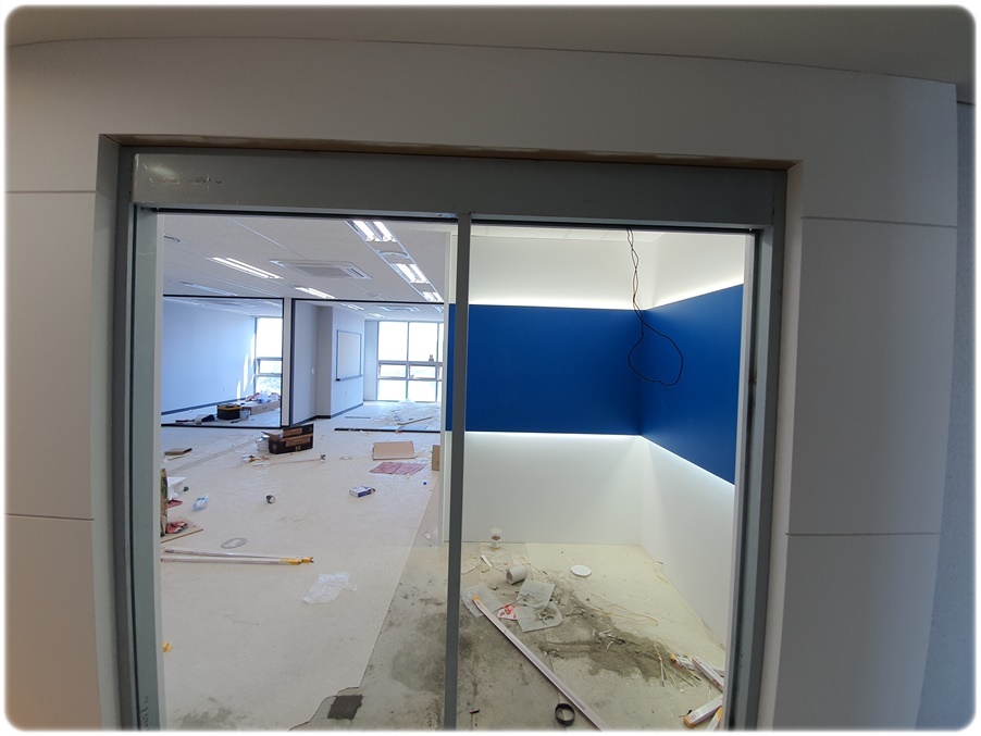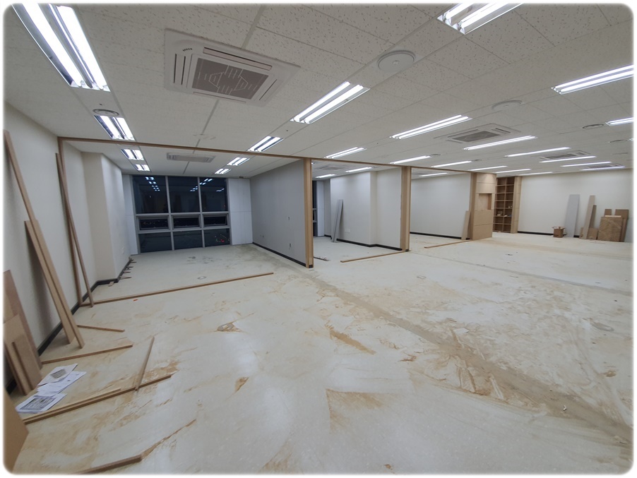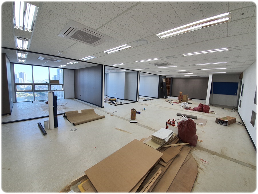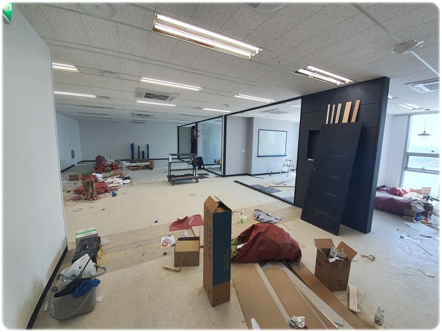 지식산업센터 사무실인테리어를 할 때 가장 신경을 써야하는 부분은 공간 분리입니다. 공간을 알차게 구성하고 동선을 효율적으로 설정하기 위해서는 공간 분리가 중요하기 때문에 우선 목공 작업으로 가벽을 만들어 각 공간을 나누고 그에 필요한 배선, 배관, 공조시스템, 소방설비 등을 디자인설계에 맞게 정리해 원활한 시공과 사용이 가능하도록 합니다.