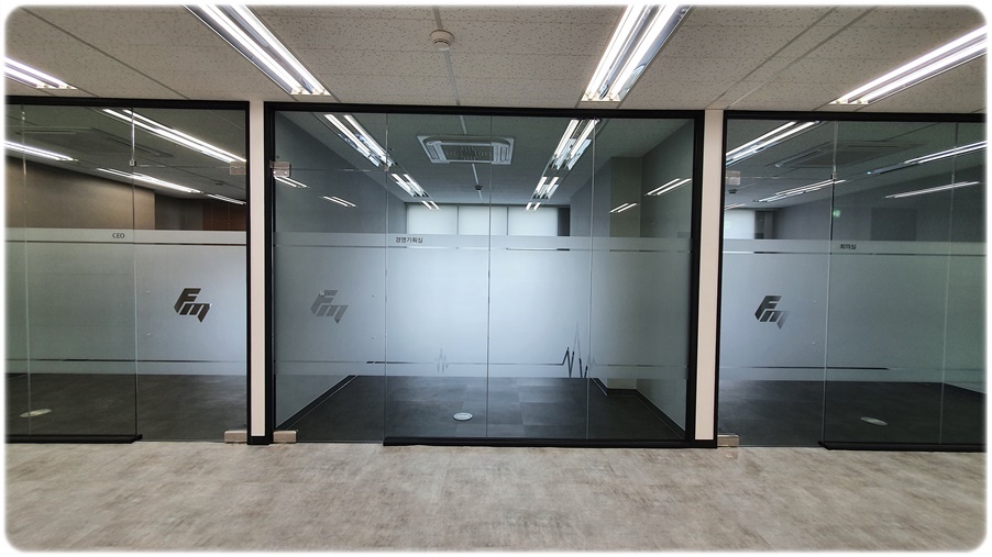이 때,기업의 로고와 이미지를 디자인 커팅한 시트지를 시공하면 회사의 정체성을 계속해서 인지하게 하는 효과가 있습니다. 블랙 프레임과 투명하면서 빛이 반사되는 유리의 조화가 인테리어적 요소로도 활용돼 세련된 공간을 만들고 있습니다. 남양주 다산신도시 dimc테라타워 사무실인테리어를 하실 때 좁은 공간을 넓고 화사하게 만들고 싶으시다면 유리파티션을 추천드립니다.