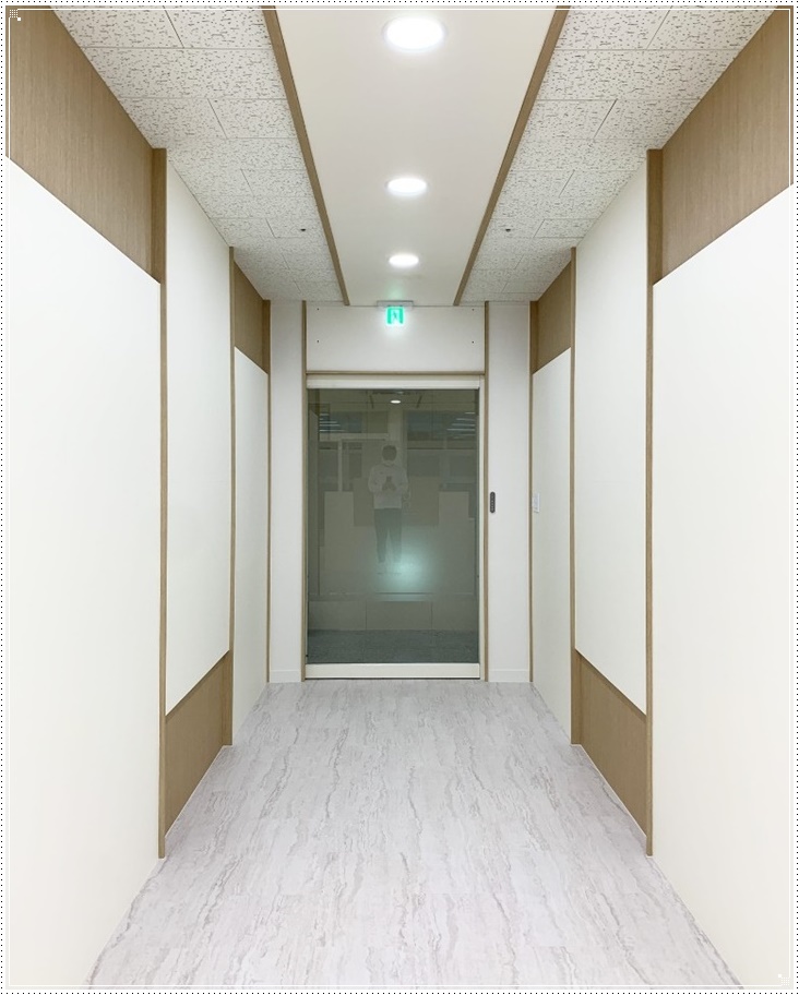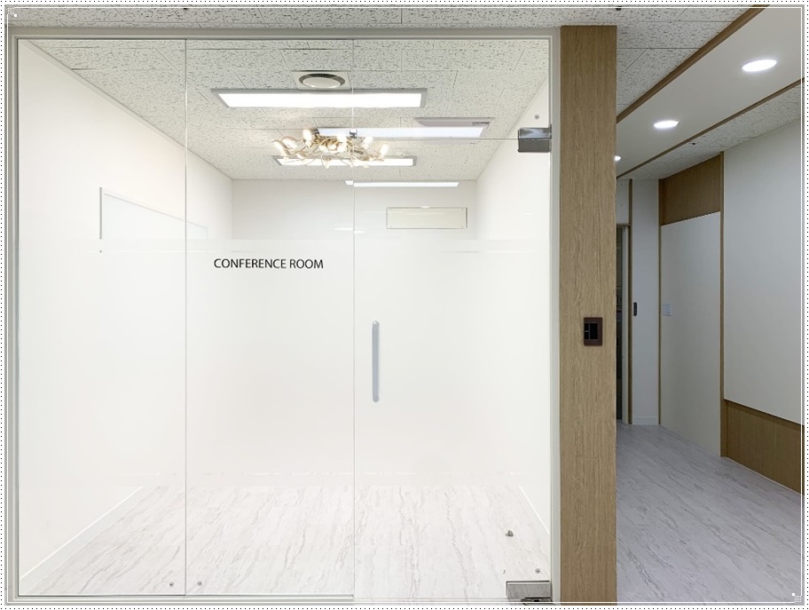 개별 공간은 불투명 시트지를 시공한 유리가벽을 세우고 화이트 프레임과 손잡이를 적용했는데요, 연한 우드톤과 화이트로 마감된 사무실인테리어와 굉장히 잘 어울리는 것을 확인할 수 있습니다.