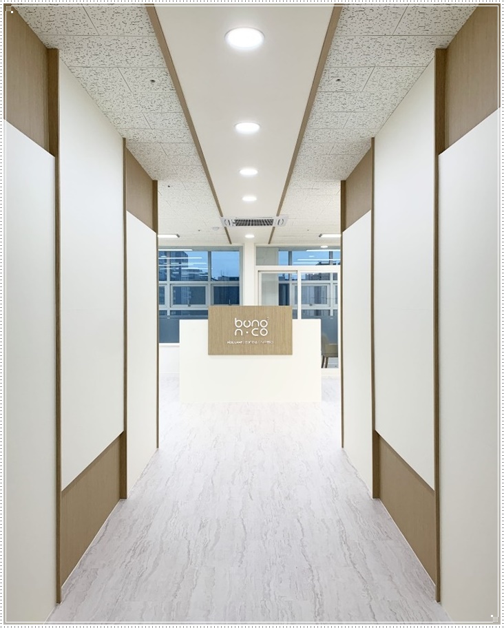 오늘은 남양주 별내 동양 파라곤스퀘어에 시공한 모던 심플 지식센터 사무실인테리어 사례를 소개해 드리겠습니다. 전체적으로 연한 우드톤과 루버디자인을 적용하고 간접조명을 상하로 번갈아가면서 배치해 은은하지만 세련되고 감각적인 입구 파사들르 연출하고 있습니다. 파사드는 폭이 좁은 판을 일정 간격으로 수평 배열하고 교차 시공하면서 다이내믹한 파사드를 완성했는데요, 회사 이미지와 어울리는 경쾌함과 발랄함이 잘 표현된 것 같네요.