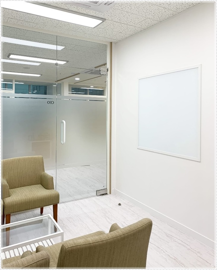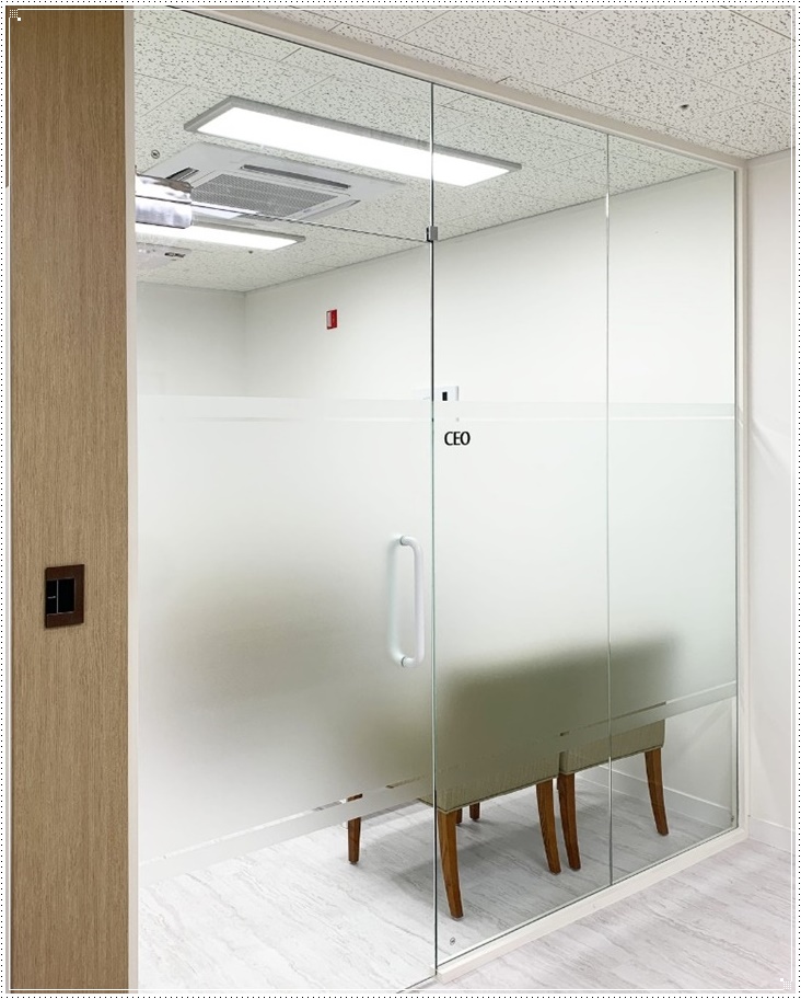 하지만 너무 적나라하게 노출되거나 시선이 마주치면 프라이버시가 보장되지 않기 때문에 불투명 시트지나 반투명 시트지를 시공해 독립성을 확보할 수 있게 시공해드리고 있습니다. 그러나 전체를 시공하면 유리 가벽의 장점을 완전히 살리지 못할 수 있으므로 시선이 부딪히는 적당한 위치에 시공해 독립적이면서 개방적인 공간을 만들었습니다.