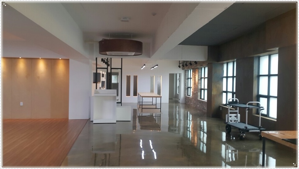 촬영스튜디오 사무실인테리어의 핵심인 호리존트(Horiwont) 공간입니다. 호리존트는 면과 면이 만나는 모서리 부분을 라운딩 형태로 작업해 각이 생기지 않도록 함으로써 무한 공간의 착시 현상을 유도해 피사체에 시선을 집중시키는 효과를 주는 세트로 인물 프로필 촬영이나 제품 광고 촬영 등에 많이 이용되는 공간입니다. 코너 라운드의 지지대를 얼마나 완벽하게 다듬고 레벨을 맞추는지에 따라 마감이 달라지기 때문에 작업자의 실력에 따라 완성도가 달라지는데요,