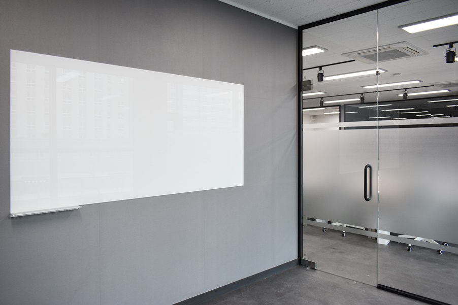 개별 사무실로 사용될 공간의 입구 모습으로 한쪽 벽면에 깔끔하게 화이트 보드가 설치되어 있는 것을 보실 수 있습니다.