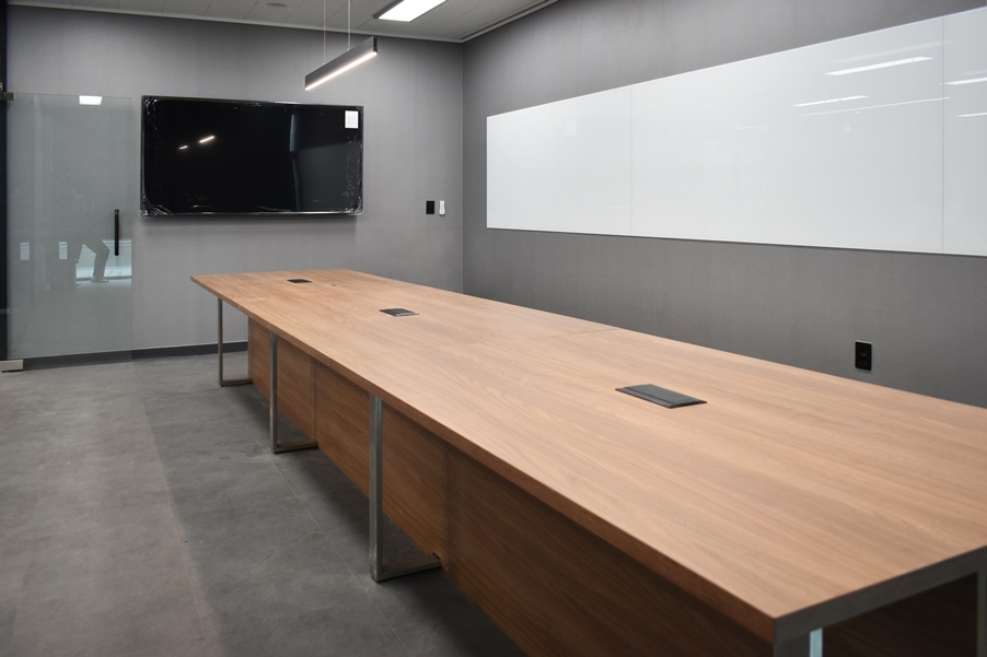 회의실로 사용될 공간으로 앞서 보신 공간보다 조금 더 큰 규모를 자랑하고 있습니다. 비슷한 인테리어로 시공되어 통일감을 주고 있으며 한쪽 벽면에 화이트 보드 설치와 함께 입구쪽에는 벽걸이티비를 더하였습니다.