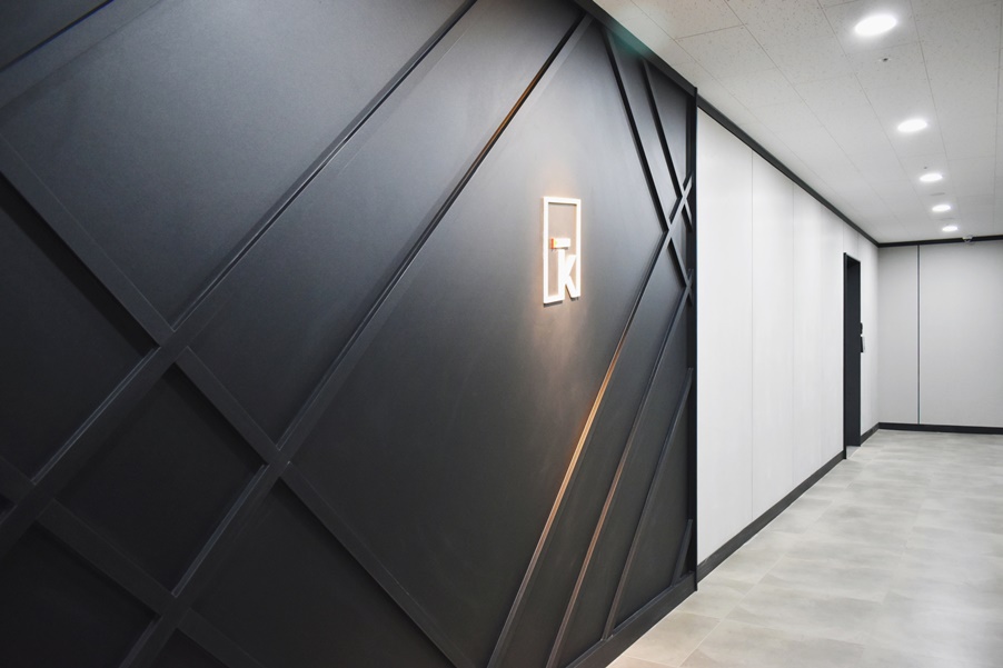 앞서 제일 처음 보여드린 회사 로고가 들어간 파티션입니다. 회사 출입구에 위치하고 있는 곳으로 따스한 간접 조명이 공간을 비추고 있어 아늑해 보입니다.