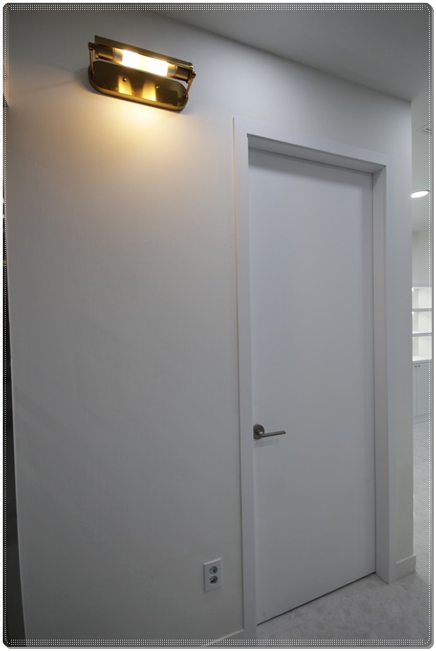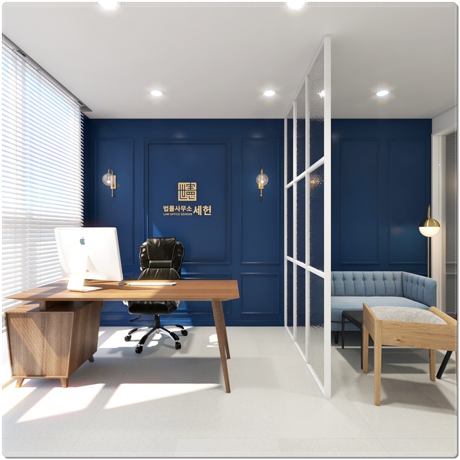 외부 파사드입니다. 업체의 로고디자인에 사용된 클래식 블루를 메인 컬러로 설정해 벽면을 채웠고 웨인스코팅을 시공해 고급스러움을 더했으며 회사명 사인물 및 벽부조명으로 포인트를 주었습니다. 방화문 안쪽에는 시트지를 부착한 유리도어를 설치해 개방적이면서 시선을 분산시켜 직접적인 노출은 차단했으며 블랙 컬러 손잡이를 더해 세련된 디자인으로 구현했습니다.