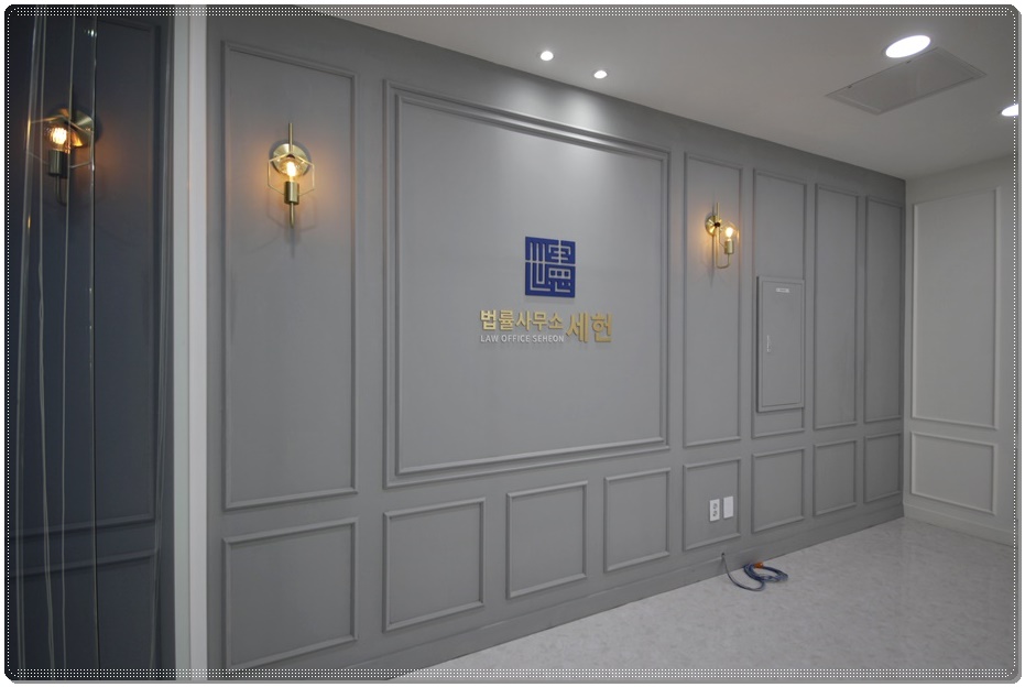 인포메이션 프론트월은 웨인스코팅을 시공한 그레이 벽면을 적용해 통일성을 이루면서 차분한 공간이 되도록 했고 벽부 조명과 업체명 및 로고를 시공해 포인트를 줬습니다.