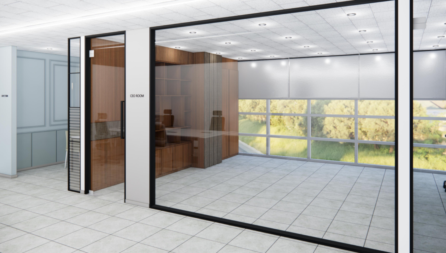 첫번째 대표실입니다. 개방감 있는 전면 통창으로 탁 트인 시야를 자랑합니다. 또한, 천장은 건물의 기존 구조 그대로를