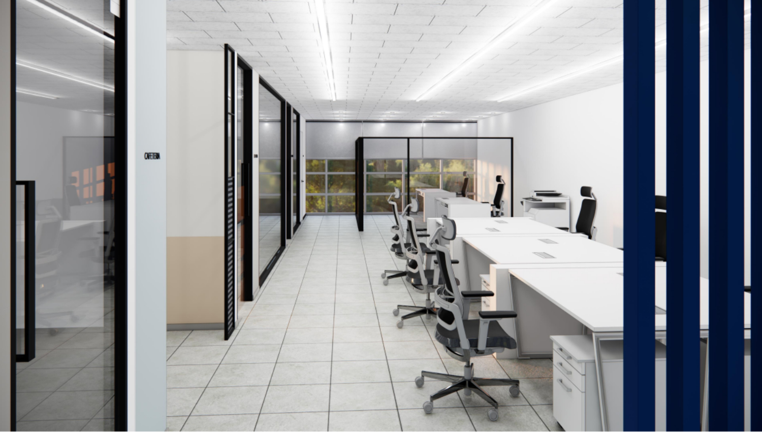 입구 공간과 사무실 내부는 블루 컬러의 우드 파티션으로 가볍게 구분해주었습니다. 파티션을 설치해 복도를 길게 만들어 공간이 더 길어보이는 느낌을 주었습니다.