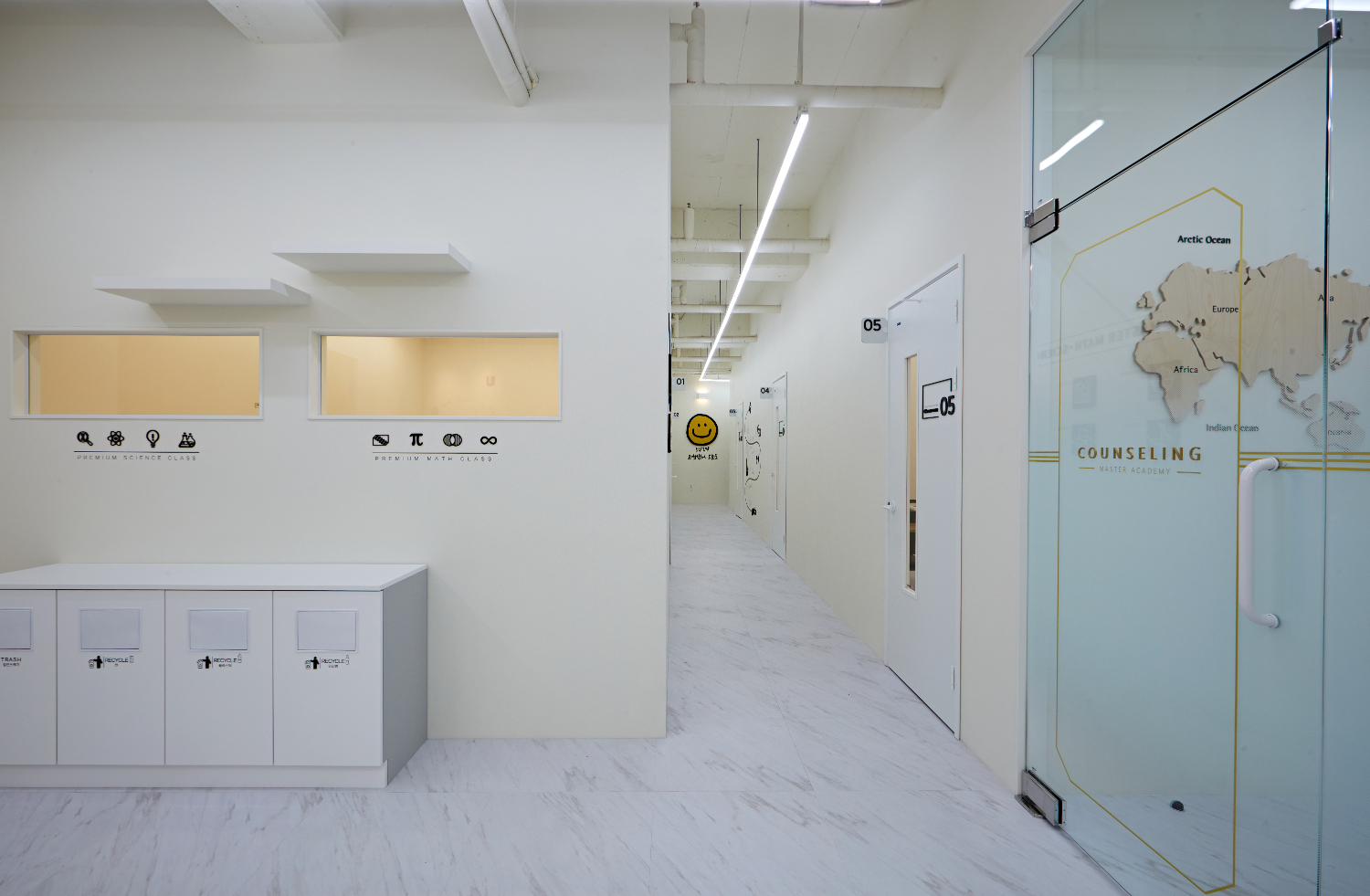 입구 파사드부터 살펴보겠습니다. 화이트 인테리어를 대표하듯 외관도 화이트로 도장하였는데요.깔끔한 외벽에 블랙으로 수학과 과학을 상징하는 기호들로 픽토그램을 부착하고 로고로 장식하였습니다. 들어가는 입구는 유리로 하여 개방감을 주면서도 아래에는 불투명하게 그라데이션을 주어서 프라이빗한 느낌까지 함께 느끼도록 하였습니다.