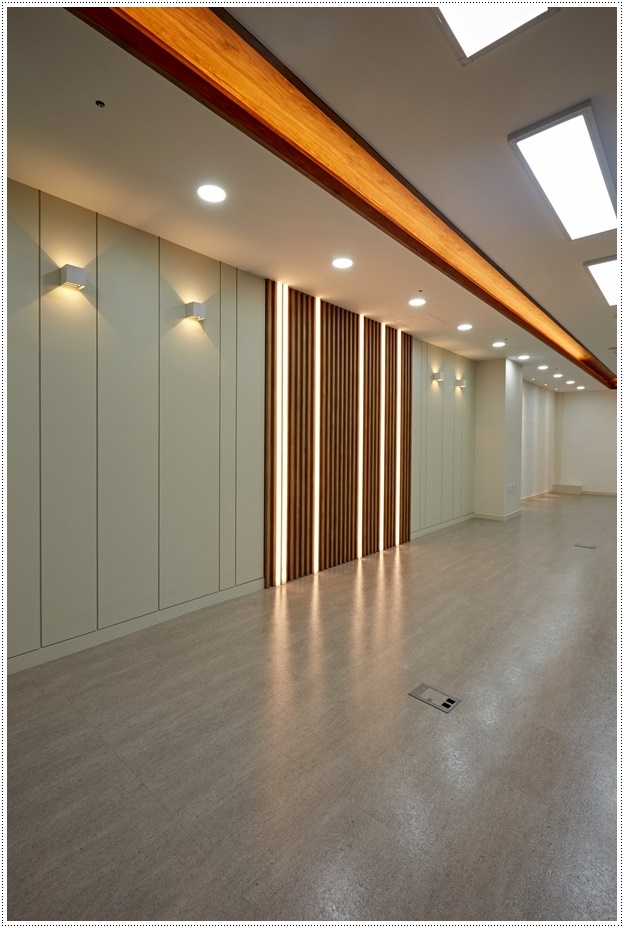 로비에서 오른쪽으로 돌아 들어가면 공용 사무실이 있습니다. 통합형으로 시공한 사무실로 조직 개편, 증원 등에 유리하고 공간을 다양하게 활용할 수 있으며 업무 효율에 도움이 되고 있어 최근 많이 시공되는 사무실형태입니다. 외부 파사드-내부 파사드로 이어진 간살 디자인의 아트월이 공용 사무실 벽면에도 시공되면서 인테리어 통일성을 이루고 있습니다. 전체적으로 화이트로 마감하고 천장에 넓은 두께의 라인 조명과 매립형 조명을 시공해 충분한 조도를 확보했습니다.