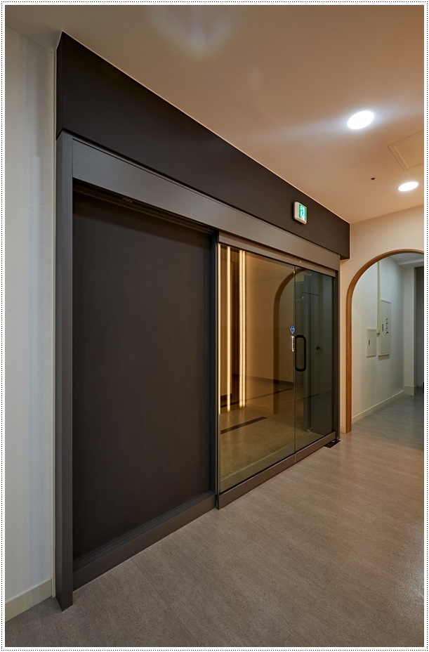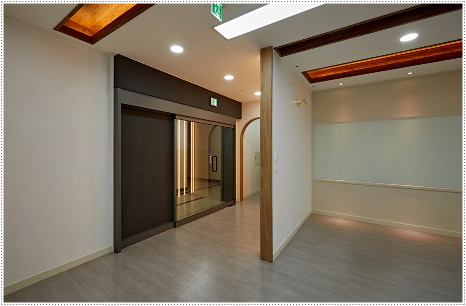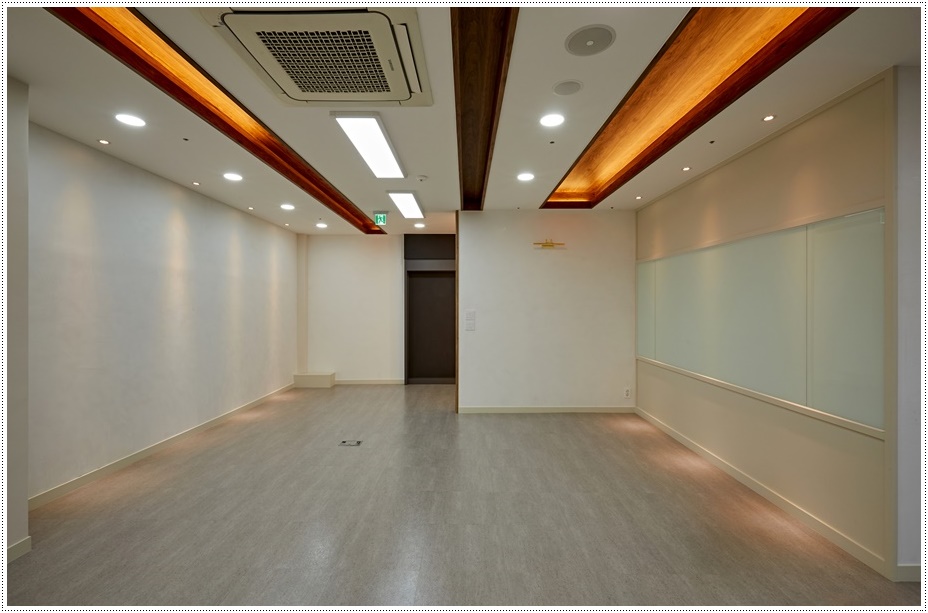 외부 파사드입니다. 화이트 & 우드의 디자인에 조명이 더해져 야간에도 멋진 첫인상을 뽐내고 있습니다. 특히, 우드 간살 디자인이 적용된 파사드는 고급스러우면서 클래식한 느낌이 드는데 화이트톤의 조명빛이 더해지니 모던한 세련됨이 연출됩니다. 도어는 유리로 시공해 우드 간살 디자인으로 시공된 내부 파사드가 외경으로 어울릴 수 있도록 했습니다.