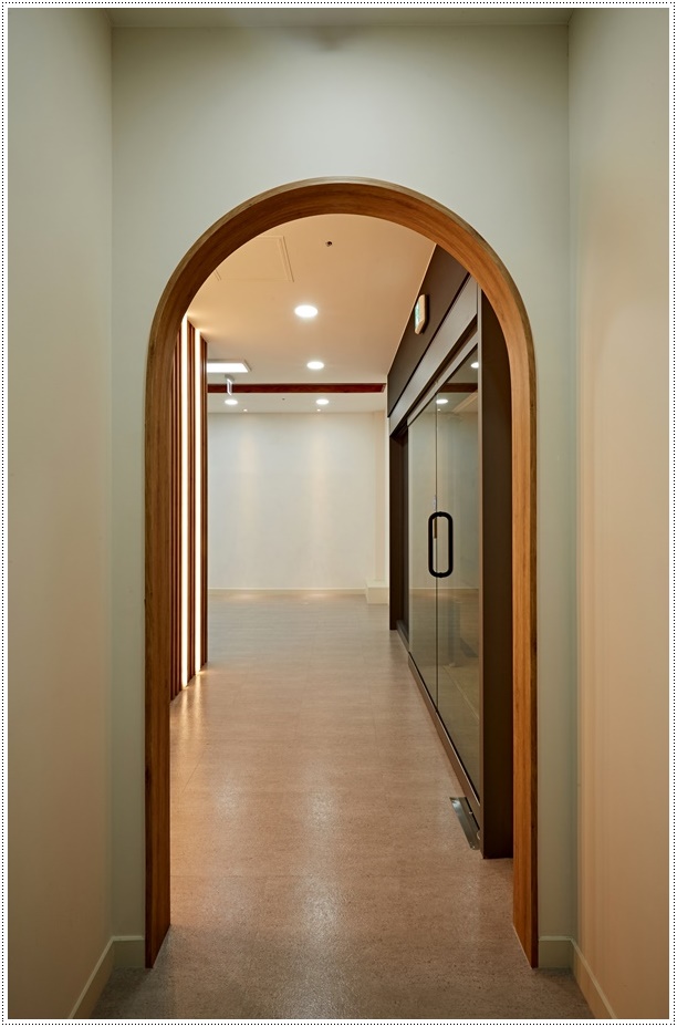 로비에서 왼쪽의 아치형 입구로 들어가면 대표실이 있습니다. 굳이 동선을 나누지 않고 공용 사무실에 공간을 분리해 대표실을 만들 수도 있지만 내부에 내력벽이 있어 철거를 하지 못하는 문제도 있거나 외부 업무가 더 많은 대표님일 경우 잦은 외출이 오히려 직원들의 근무효율을 떨어트릴 수 있기 때문에 이렇게 입구를 따로 계획하는 것도 효과적입니다.