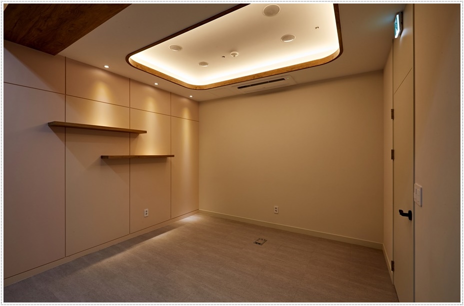 대표실입니다. 작고 아늑하지만 우물형 천장을 시공해 층고를 확보하고 전면창의 채광을 충분히 활용해 넓어 보이는 효과를 주었습니다. 부피가 큰 가구대신, 벽면에 선반을 시공해 다양한 인테리어 연출을 할 수 있도록 했는데요, 만약 좀 더 안정적인 느낌의 선반을 원한다면 벽면을 타공해 매립형으로 시공을 할 수 있죠.