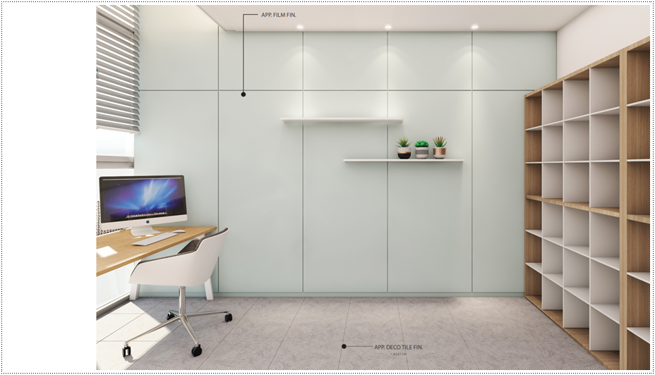 반면, 대표실은 개별 사무실로 계획하고 공용 사무실과 다른 컬러로 마감을 하면 영역성을 부여할 수 있어 클라이언트에게 신뢰감을 줄 수 있죠. 만약 면적이 협소하다면 공간을 빽빽하게 채우는 것보다는 여유를 주는 것이 사무실을 더욱 넓어보이게 하는 팁인데요, 3D 이미지에서처럼 선반을 벽면에 달거나 문이 없는 오픈형 수납장을 시공하면 수납은 보완하고 진열되는 소품에 따라 인테리어 분위기가 달라집니다.