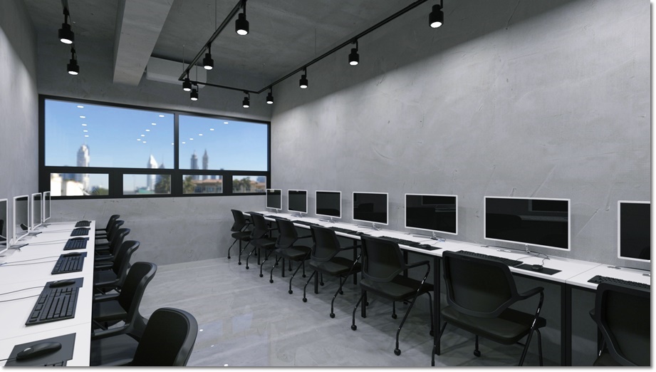 일반적인 강의실 외에도 실습을 진행할 수 있는 컴퓨터실도 따로 마련했습니다. 일반 강의실과는 다른 벽면을 보는 좌석 배치를 적용해 강사가 자유롭게 다니면서 수업이 효율적으로 진행될 수 있도록 했습니다. 벽면에 다른 인테리어 장식을 하지 않아 모니터를 보는 것 외에 시선이 분산되지 않기 때문에 좀 더 집중할 수 있을 것으로 기대됩니다.