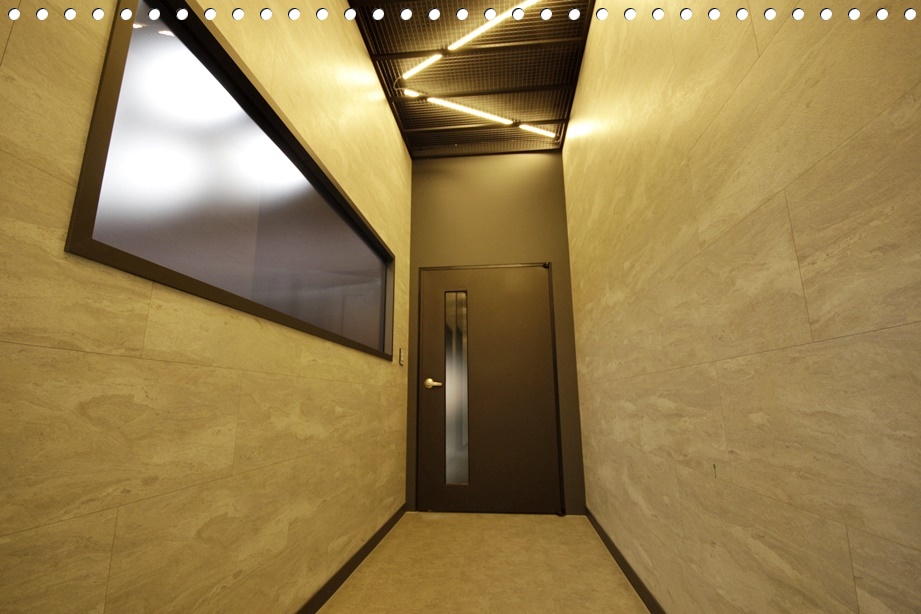 복도의 벽면은 베이지톤의 석재무늬 타일로 마감하고 바닥도 같은 톤을 적용했으며 천장은 철망을 시공해 빈티지하면서 감각적인 공간이 되도록 했죠. 각 공간으로 들어가는 도어와 몰딩, 창문 프레임은 천장 마감 색상과 같은 블랙 컬러를 적용해 포인트를 줬고 불투명 창문을 시공해 개방감을 주었습니다.