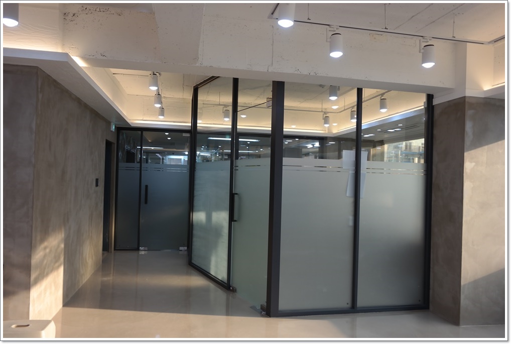 고객님의 니즈를 적극 반영해 전체적으로 답답해 보이지 않으면서 창으로 들어오는 자연광을 공유할 수 있도록 유리 가벽을 적용했고 대신, 개별 사무공간은 불투명 시트지를 시공해 프라이버시를 확보했습니다.