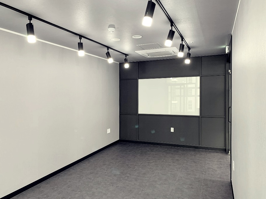 회의실로 사용될 개별 사무 공간입니다. 블랙 레일 조명을 설치하여 세련된 멋진 분위기를 보여주는 공간으로 완성되었습니다.