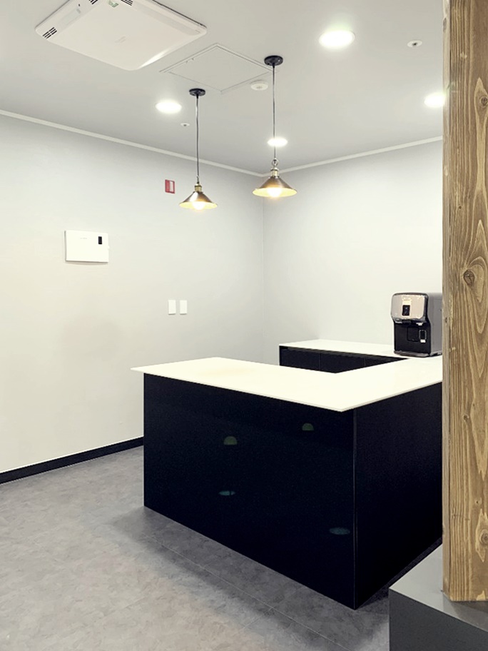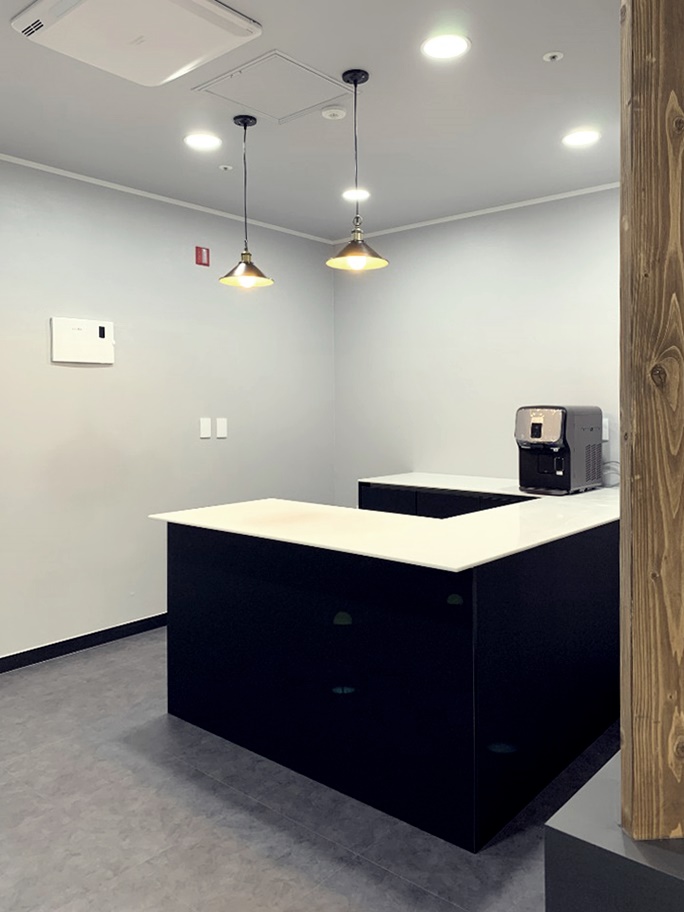 웨인스코팅 디자인에 회사 로고와 이름을 넣어 깔끔하게 연출하였습니다. 공간의 화사함과 따스함을 높이기 위해 간접조명을 벽쪽으로 연출한 모습 확인해 보실 수 있습니다.