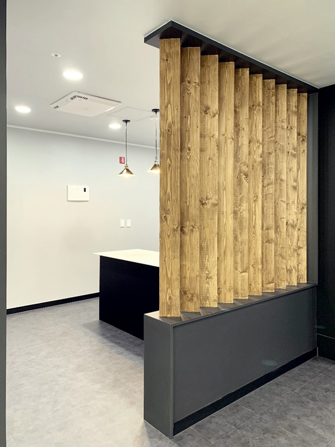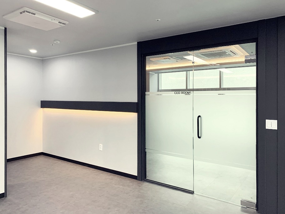 개별 사무 공간 입구는 깔끔한 블랙 컬러 프레임으로 시공 하여 마무리 하였으며 옆쪽 벽면에도 같은 컬러의 라인으로 더하여 세련된 분위기로 연출하였습니다. 그리고 라인을 따라 간접조명을 넣어 공간에 포인트를 주었습니다.